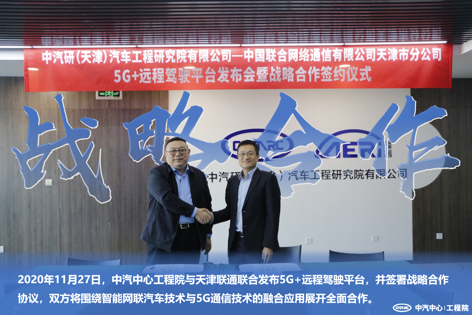 2020年11月27日,中汽研(天津)汽車工程研究院有限公司(以下簡(jiǎn)稱“中汽中心工程院”)與中國(guó)聯(lián)合網(wǎng)絡(luò)通信有限公司天津市分公司(以下簡(jiǎn)稱“天津聯(lián)通”)在天津舉行“5G+遠(yuǎn)程駕駛平臺(tái)”發(fā)布會(huì)暨戰(zhàn)略合作簽約儀式。中汽中心工程院院長(zhǎng)高繼東、天津聯(lián)通產(chǎn)研院院長(zhǎng)李佳力以及雙方有關(guān)部門負(fù)責(zé)人參加。