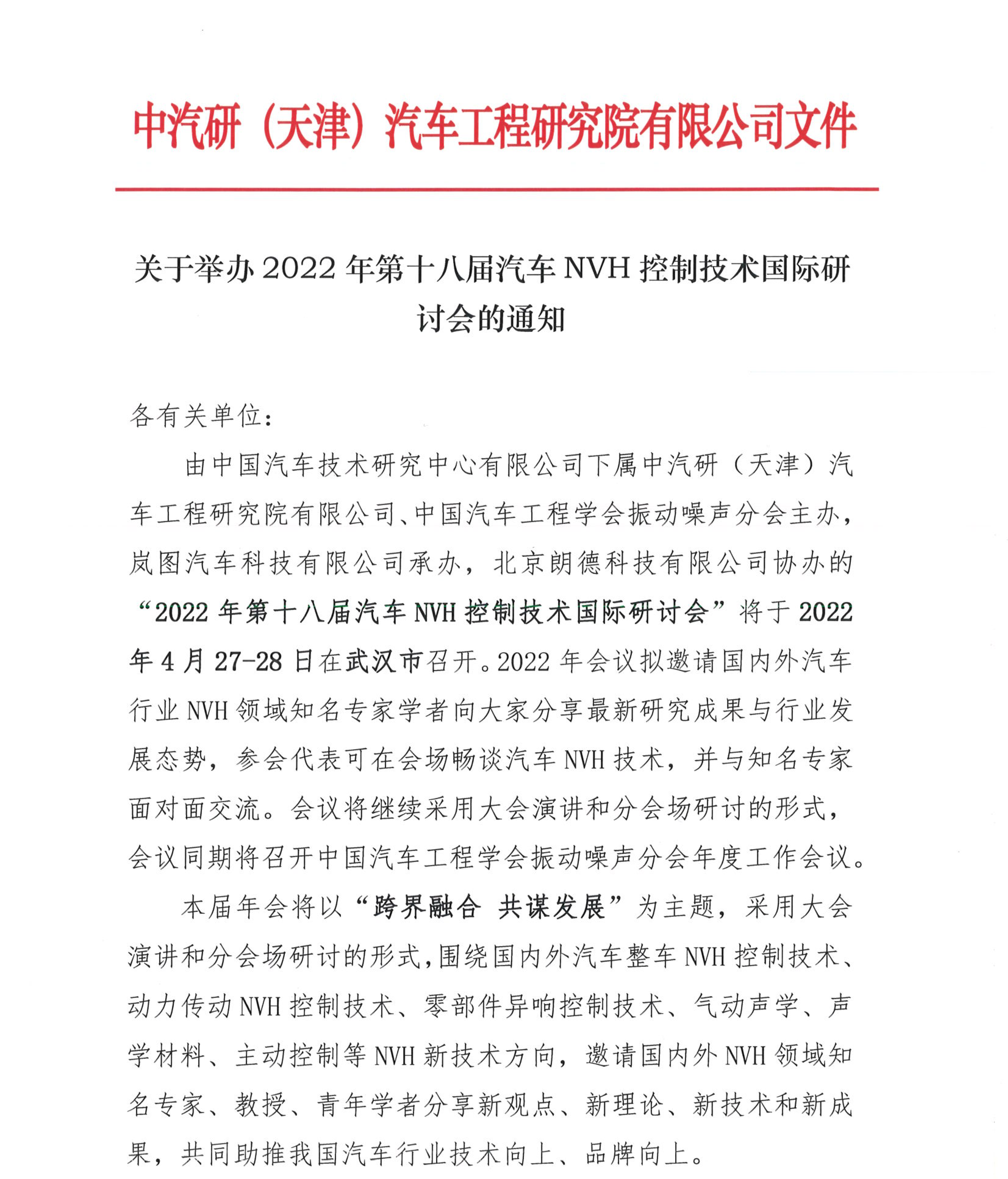 關(guān)于舉辦2022年第十八屆汽車NVH控制技術(shù)國際研討會的通知