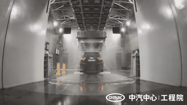 圖-中汽中心工程院環(huán)境風(fēng)洞,正在進行汽車雨水試驗