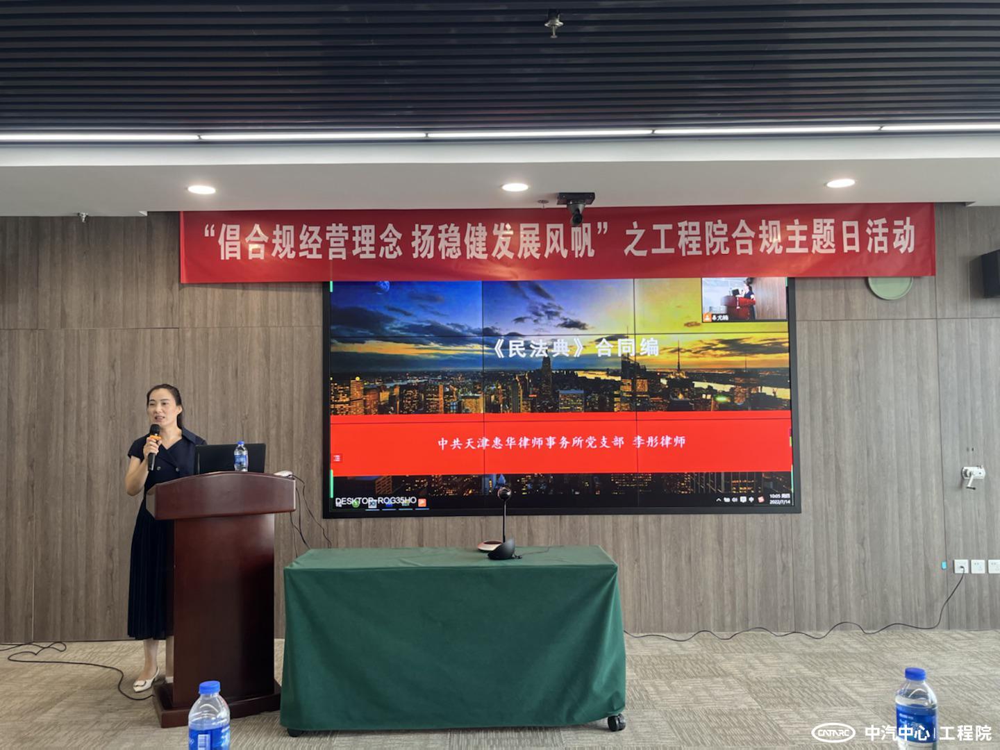 7月14日上午,在中汽中心“合規文化周”期間,工程院開展“倡合規經營理念 揚穩健發展風帆”之子企業合規主題日活動。中汽中心法律事務與合規管理部總經理孟巖,工程院黨委書記、總經理王建海以及各部門負責人、項目經理、市場經理等人員參加本次活動。