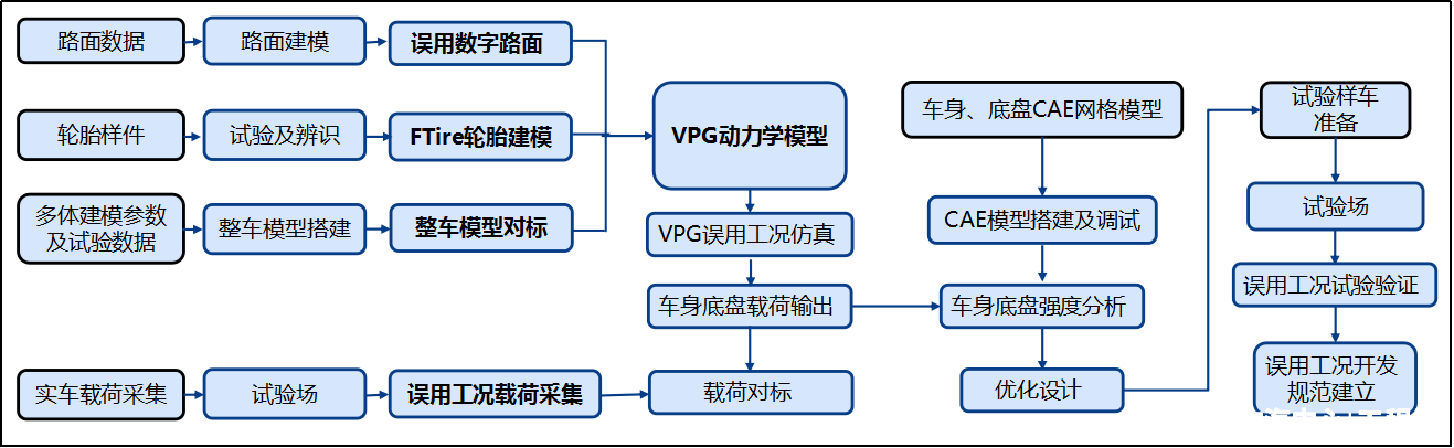 針對行業痛點,中汽中心工程院智駕技術開發部智能車輛可靠性開發團隊已多年深耕結構強度路面沖擊誤用開發技術。該項技術采用虛擬試驗場(VPG)技術,通過建立整車高精度動力學模型,結合Ftire輪胎模型、高精度誤用數字路面,利用高效算法來模擬實車運動過程中受到的動態載荷沖擊,精準復現用戶工況,確保了汽車車身、底盤等系統在各種誤用工況下的安全性與可靠性。如下為整車誤用開發流程說明: