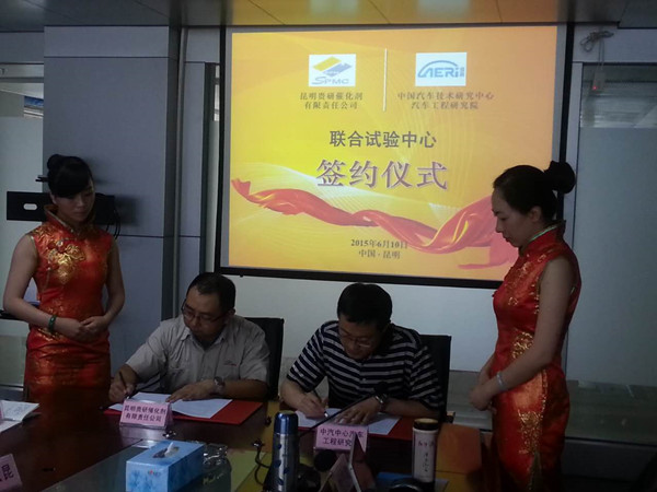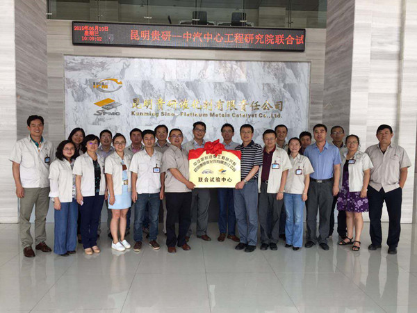 2015年6月10日,昆明貴研催化劑有限責(zé)任公司(以下簡稱“昆貴研公司”)與中國汽車技術(shù)研究中心汽車工程研究院(以下簡稱“中汽中心工程院”)成立“聯(lián)合試驗(yàn)中心”揭牌儀式在昆貴研公司舉行。參加此次儀式領(lǐng)導(dǎo)有昆貴研公司盧軍董事長、魏軍副總經(jīng)理、賈庭渝副總經(jīng)理、賀小昆副總經(jīng)理和各部門負(fù)責(zé)人以及中汽中心工程院高繼東院長、劉雙喜主任、胡濟(jì)民主任。揭牌儀式由昆貴研公司馮豐副總經(jīng)理主持。