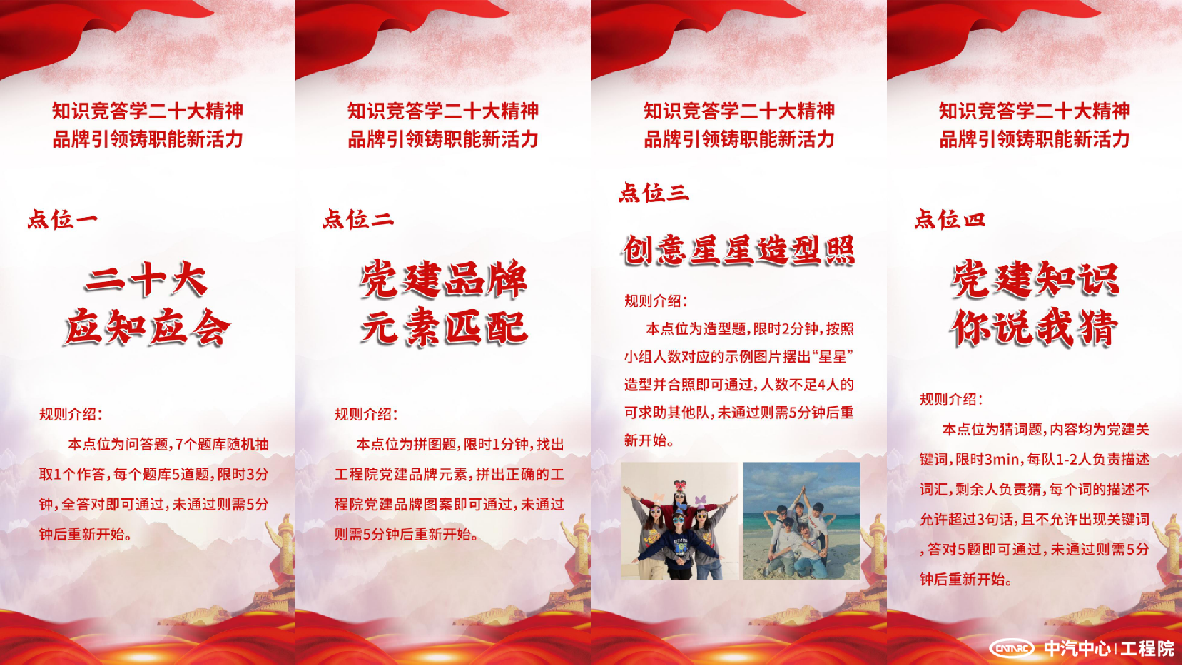 活動當天以團隊合作“星星向黨”拼圖為起點,分別串聯“二十大應知應會”“黨建品牌元素匹配”“創意星星造型照”“黨建知識你說我猜”四個打卡點位,形式新穎、內容豐富,各小組都展現出濃厚的興趣。